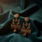 • Temple Style Earrings: Intricately carved antique-gold hangings featuring traditional figures and dangling ruby-hued beads.