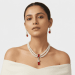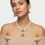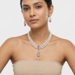 There are few things as sophisticated as a string of pearls—until you add the fire of diamonds. The “Royal Grace” set blends the soft, romantic glow of pearls with the sharp brilliance of crystal stones. Designed to sit perfectly along the collarbone, this necklace frames the face with light, making it an instant confidence booster. Whether she’s wearing a chiffon saree or an evening gown, this set adds a “red carpet” finish to her look.