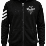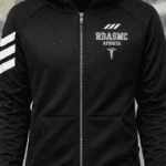 The sweatshirt is crafted in a solid black fabric with a subtle textured finish, giving it a clean and modern appearance. A hooded neckline adds both style and functionality, making it suitable for cooler weather or outdoor use. The full front zipper allows easy wearing and adjustable comfort, while maintaining a structured and streamlined look.